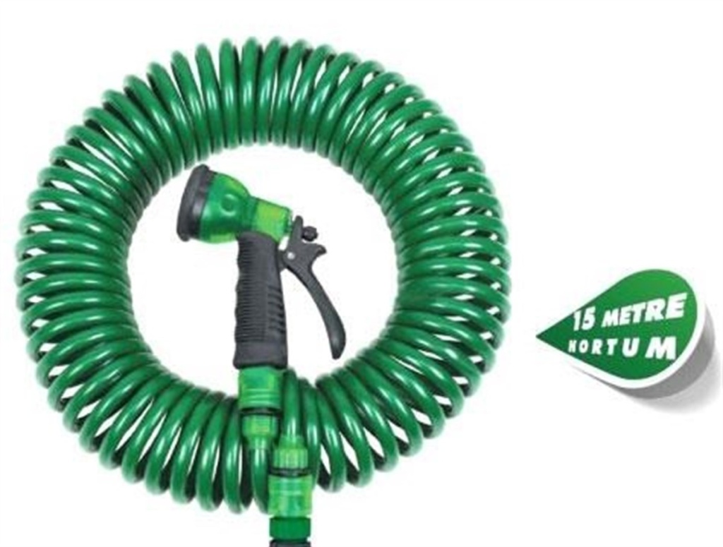 15 Metre Spiral Hortum + 4 Fonksiyonlu Özel Sulama Tabancası (4915) Go-53-vice/(1395)
